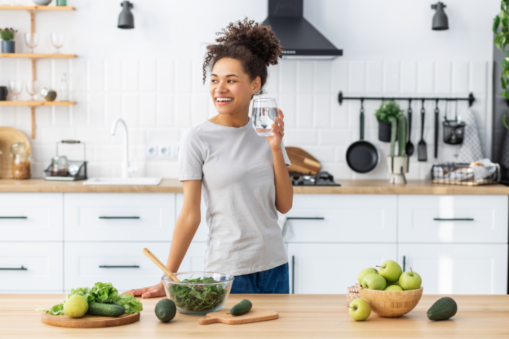 Woman cooking healthy food with glass of clean water, looking away and smiling. African American young female preparing salad for dinner or breakfast in home kitchen. Healthy diet eating